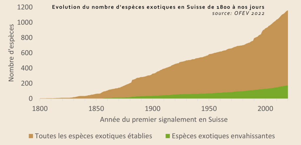 Infofauna et plus spécifiquement InfoSpecies (www.infospecies.ch) est un organisme qui tient à jour la listes de néobiotes et leurs répartitions territoriales en Suisse. Même si le nombre de néobiotes est augmentation régulière depuis l’Epoque contemporaine et plus spécialement la Révolution industrielle et ses échanges commerciaux, on observe une croissance particulièrement importante dès les années 1975. Il est fort probable que le tourisme intercontinental et la mondialisation contribue grandement à ce phénomène.