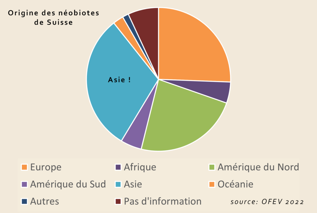 Qu’elles soient envahissantes ou pas la grande majorité des néobiotes proviennent d’Asie (41%).